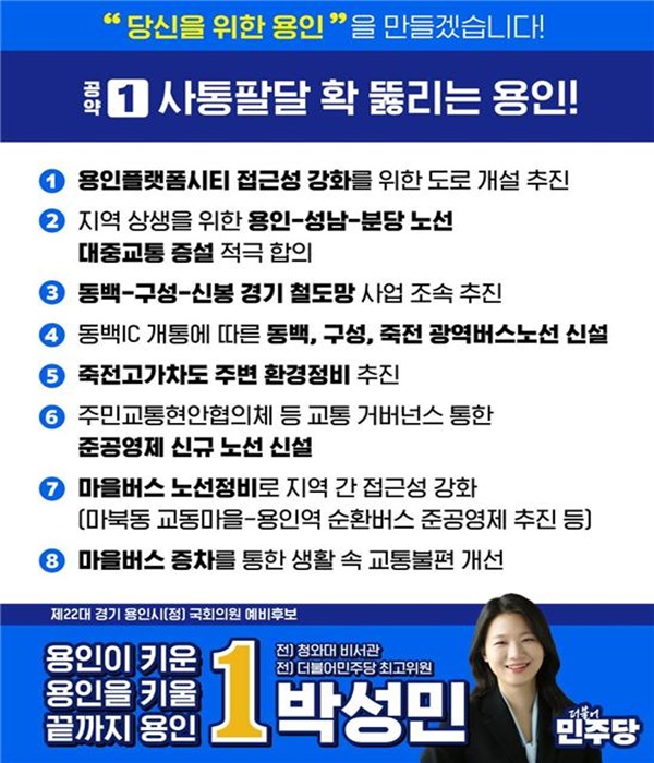제22대 국회의원 용인시(정) 박성민 예비후보는 살기 좋은 용인을 위한 공약으로 ① 사통팔달 확 뚫리는 용인, ② 쾌적하고 환경친화적인 용인, ③ 놀거리 풍성한 용인, ④미래세대를 확실하게 키우는 용인을 목표로 교통, 도시환경, 생활문화, 미래세대 투자 등 총 4개 분야를 아우른다.