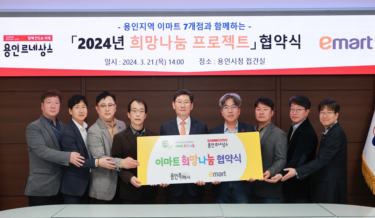 용인특례시(시장 이상일)와 용인지역 내 이마트 7개 지점이 지난 21일, ‘2024년 희망나눔 프로젝트’ 업무협약을 체결하고 소외계층 돕기에 적극 힘을 모으기로 했다.