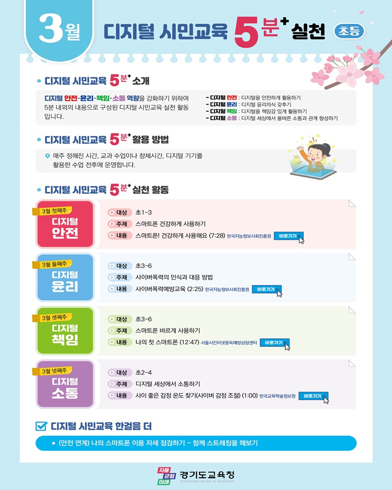 ‘디지털 시민교육 5분+ 실천’은 스마트기기 보급과 활용 증가에 따라 디지털 안전·윤리·책임·소통 역량을 강화하기 위해, 5분 내외 내용으로 구성된 디지털 시민교육 실천 활동이다.