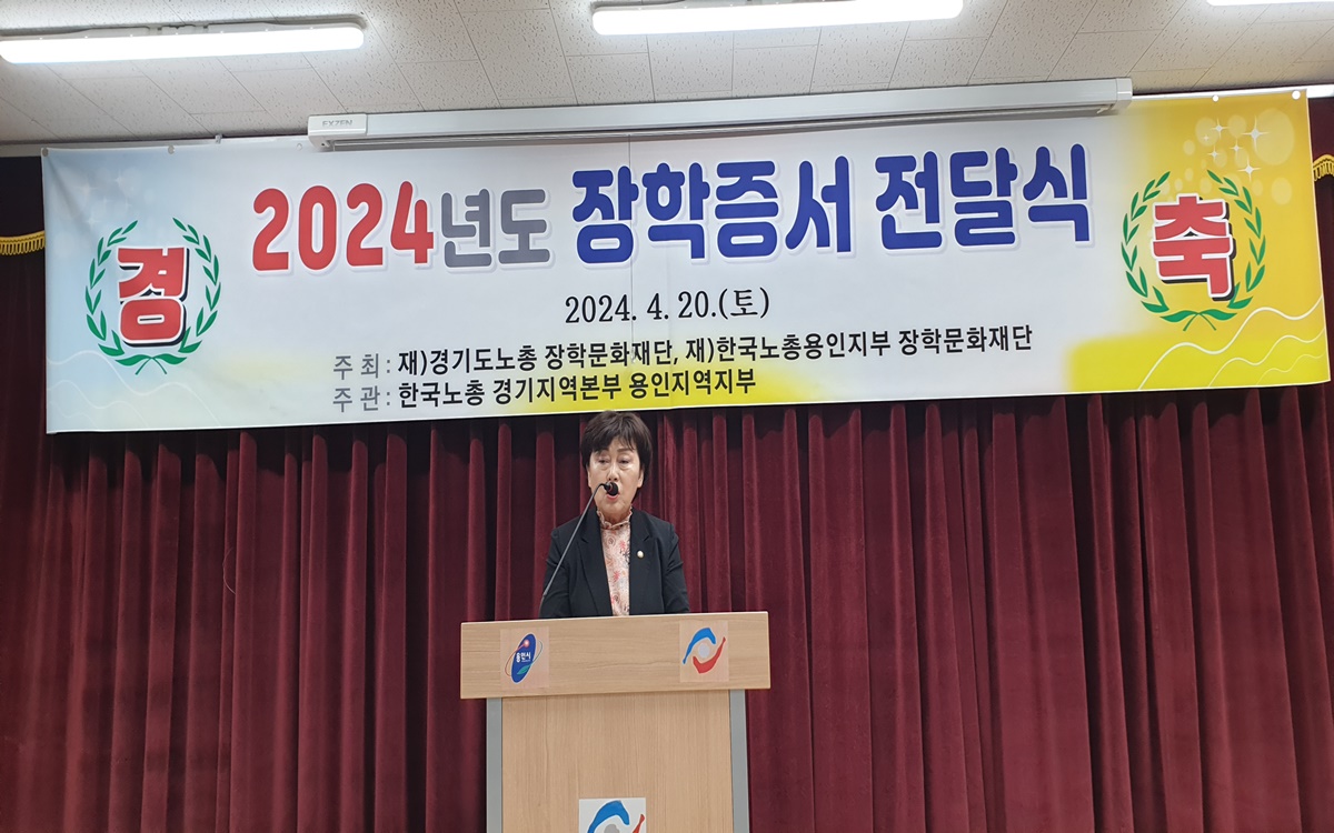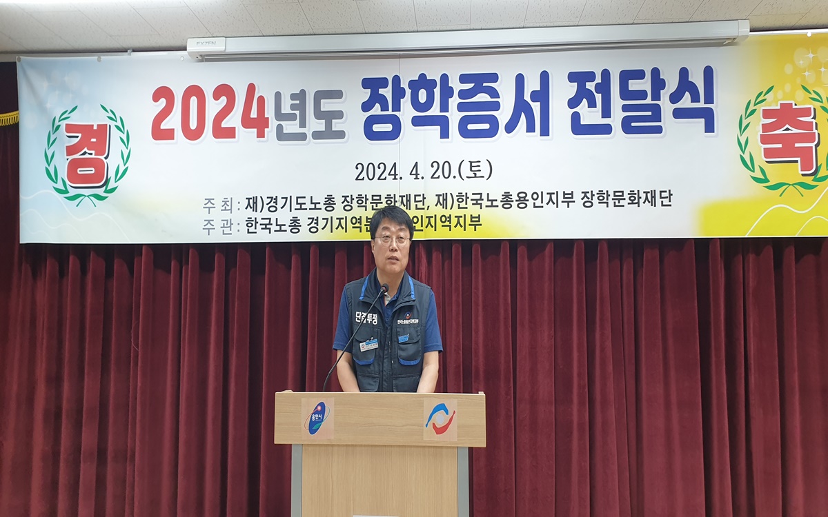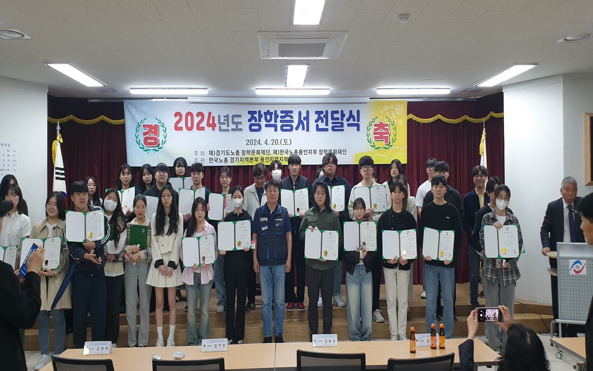 한국노총용인지역지부(의장 이상원)에서는 4월 20일. 용인관내 노동자 자녀를 대상으로 장학생을 선발하여, 용인시노동복지회관 대회의실에서 장학생 및 학부모 내 · 외빈등 200여명이 참석하여, 「2024년도 장학증서 전달식」을 개최하였다.