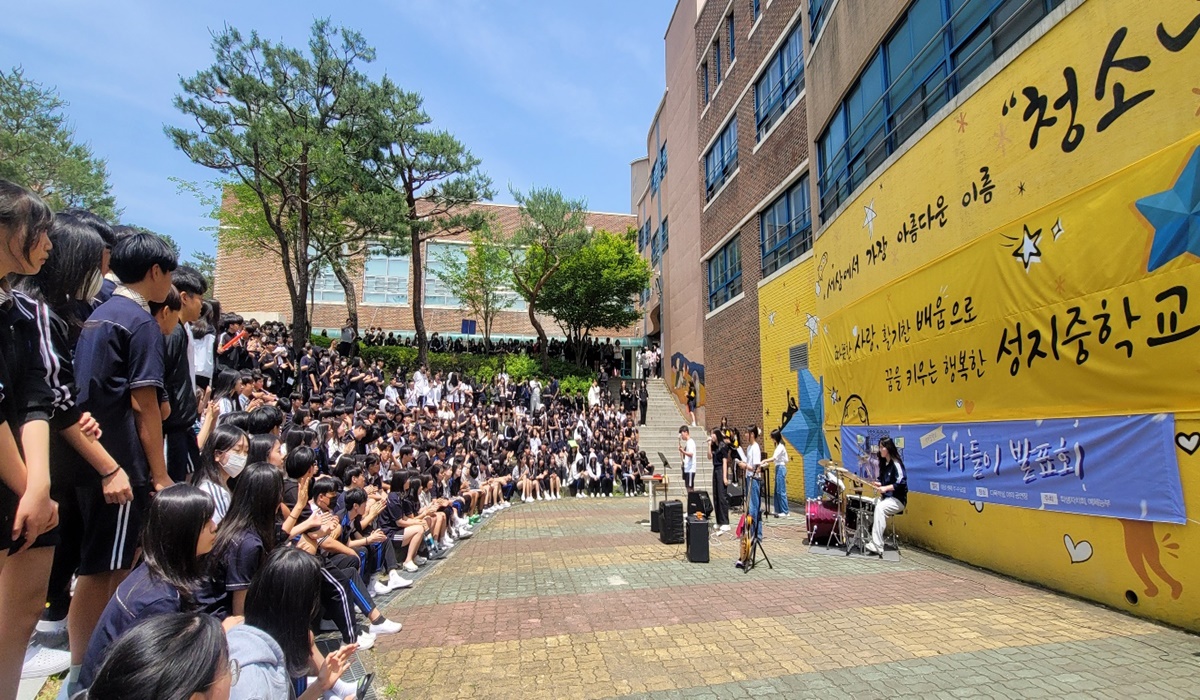 용인 성지중학교(교장 김성태)는 22일 점심시간을 활용해, 벽화가 그려져 있는 학교 별관 야외 공연 무대에서, 학생자치회가 주관하는 ‘빛깔있는 너나들이 발표회’공연을 실시했다고 밝혔다.