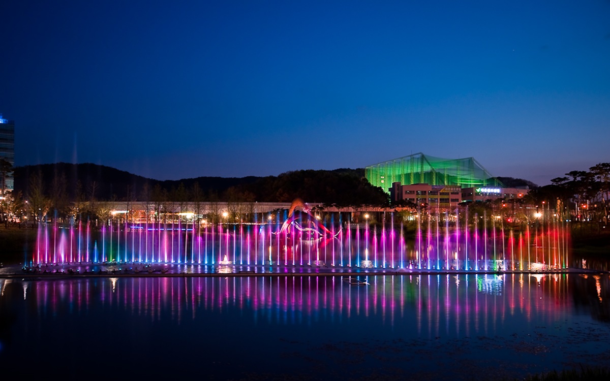 다양한 장르의 음악에 맞춰 화려한 LED 조명에 맞춰 솟아오르는, 시원한 물줄기를 내뿜는 음악 분수는, 동백호수공원의 상징이기도 하다.