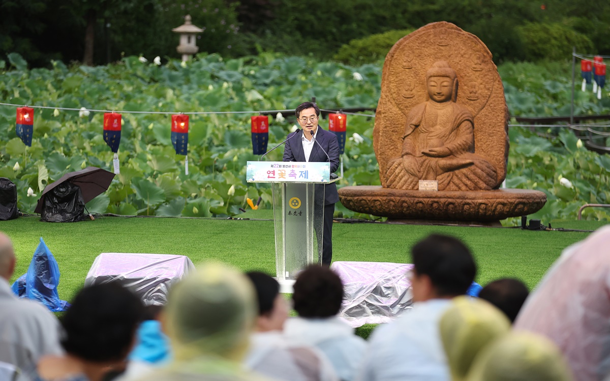 김동연 지사는 지난 17일 연꽃행사장을 찾아 행사 현장을 둘러보고, 봉선사 교구장 ‘호산’ 스님에게도 감사 인사를 전했다.