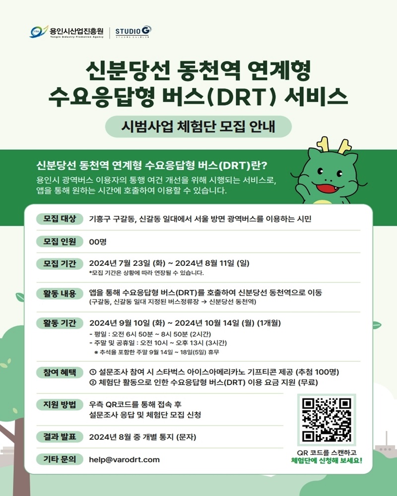 용인시산업진흥원(이사장 이상일)은 ‘신분당선 동천역 연계 수요응답형 버스(DRT) 시범운영사업‘에 참여할 체험단 100여명을 내달 11일까지 모집한다고 밝혔다.