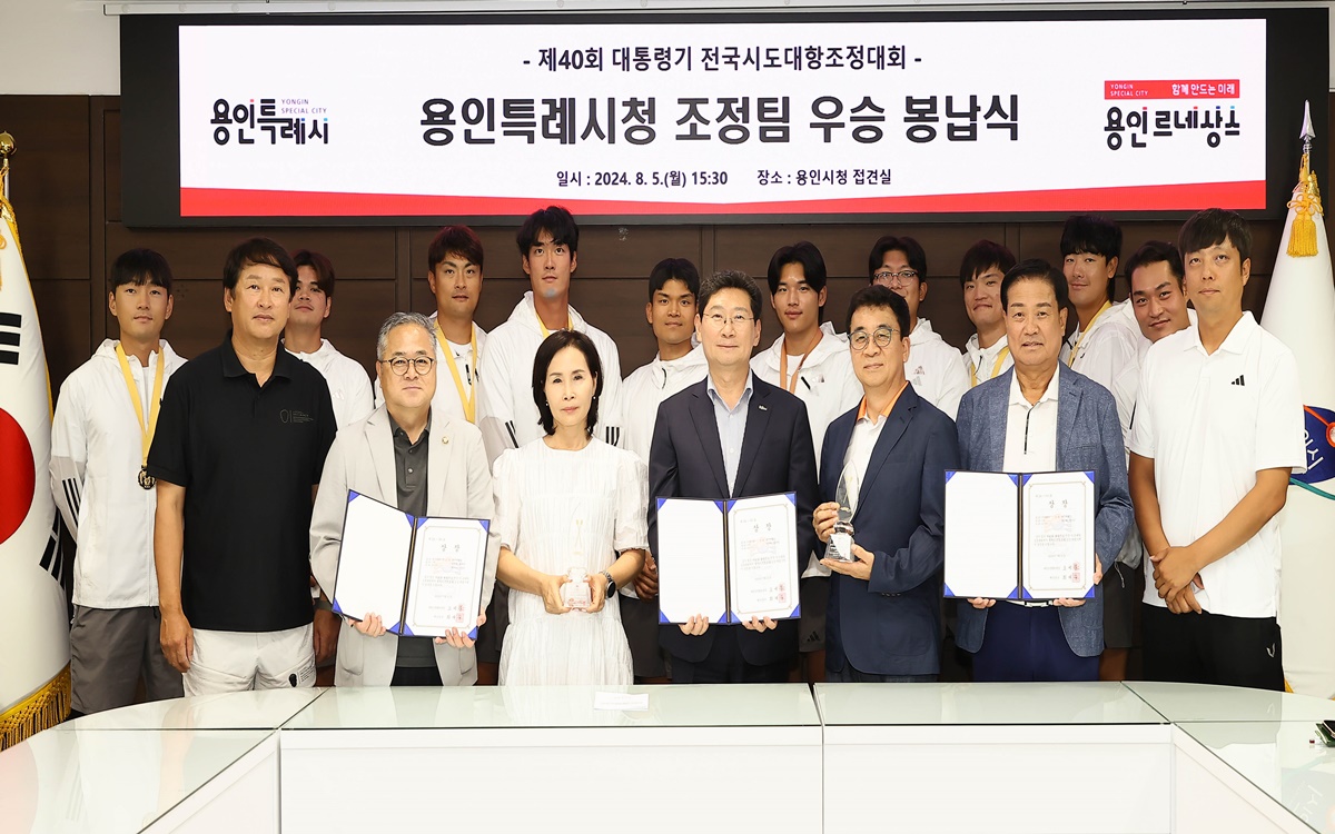 용인특례시(시장 이상일) 직장운동경기부 소속 조정팀의 우승트로피 봉납식이 5일 시청에서 열렸다.