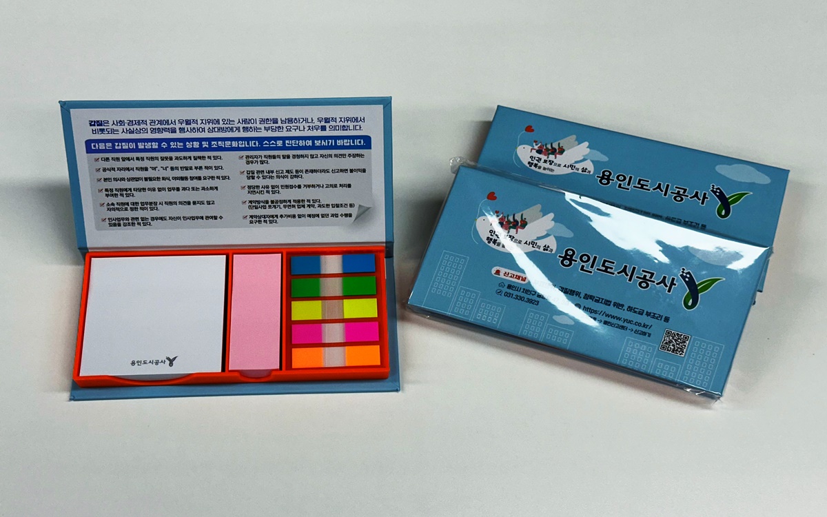 해당 홍보물은 조직 내에서 갑질이 발생할 수 있는, 상황 및 문화에 대해 진단할 수 있도록 제작됐으며, 용인도시공사 신고채널(부패행위, 갑질행위 등)에 대한 내용을 담고 있다.