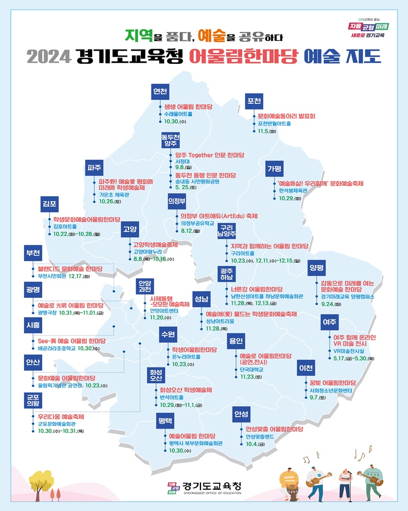 경기도교육청(교육감 임태희)이 지역별 특색있는 ‘예술어울림한마당’을 개최한다. 7일 이천을 시작으로 12월까지 25개 교육지원청에서 순차적으로 열린다.