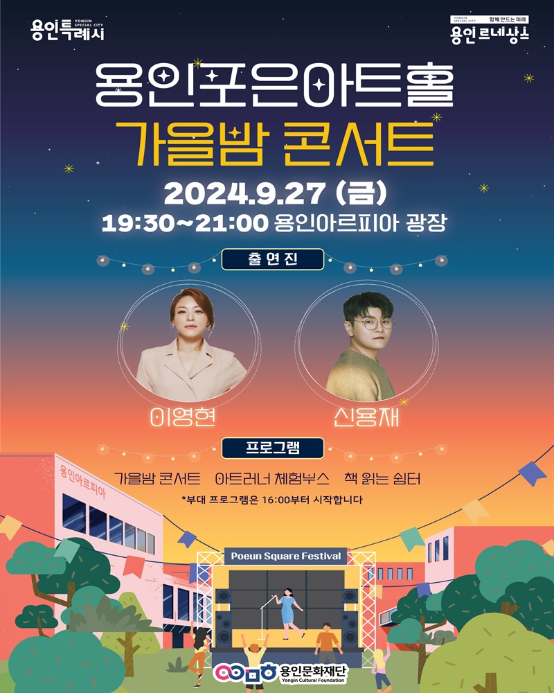 용인문화재단(이사장 이상일)은 오는 9월 27일 용인포은아트홀 앞 야외 광장에서, 책도 읽고 발라드도 즐길 수 있는 ‘용인포은아트홀 가을밤 콘서트’를 개최한다.