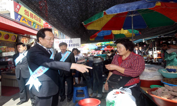 김학규 용인시장이 전통명절인 한가위를 앞두고 25일 오전 11시 용인중앙시장을 방문, 시장 상인들을 격려하고 추석물가 안정 협조를 당부했다.
