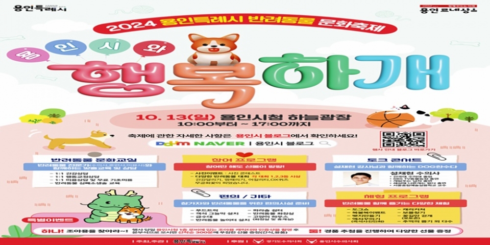 용인특례시(시장 이상일)는 지역 내 반려동물 애호가들을 위한 문화축제, ‘용인시와 행복하개’를 13일 시청 하늘광장에서 개최한다고 8일 밝혔다.