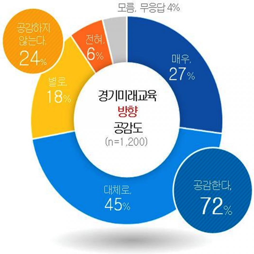 경기도민 72%가 공교육의 범위를 확대하는 경기미래교육의 방향에 공감한다고 응답했다. 또한 경기미래교육이 학생을 미래인재로 성장하게 하는 데 효과적이라는 평가도 71%에 달했다.