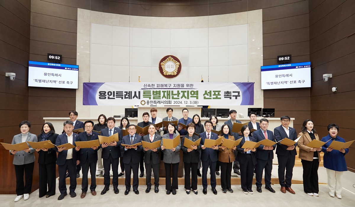 이어, “피해복구와 극복을 위해 민·관이 협력해 가용 가능한 모든 힘을 총동원해 대처하고 있는 용인 시민들의 의지에 용인특례시의회도 뜻을 함께하며 신속한 지원 대책 수립을 위해 특별재난지역 선포를 촉구한다”고 말했다.