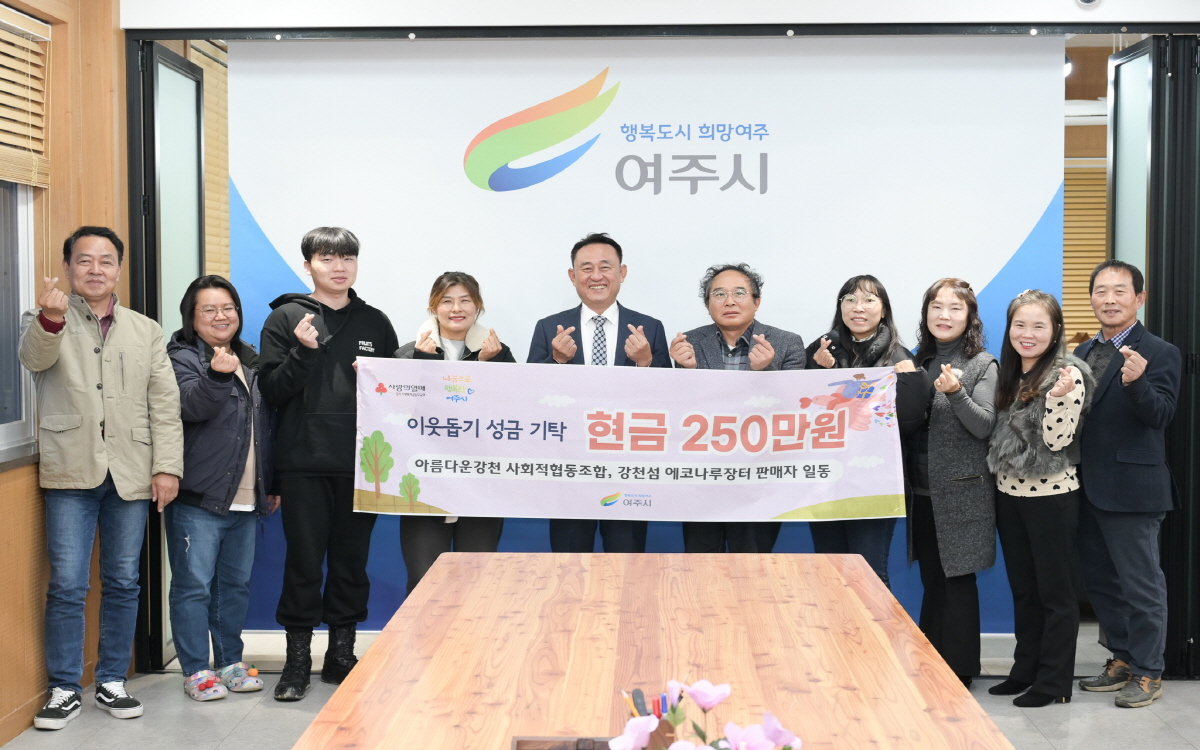 아름다운강천 사회적협동조합(대표 최근필)과 강천섬 에코나루장터 판매자 일동(베리굿니팅. 다현당, 분홍솜사탕, 북내양조장, 메이드노리터, 한아름, 후르츠팩토리, 춤추는 쏘잉, 간식타임, 천고송, 여주맥주양조장 등)이 지난 11월 29일 여주시청을 방문하여 이웃돕기 성금 250만원을 여주시에 기탁하였다.
