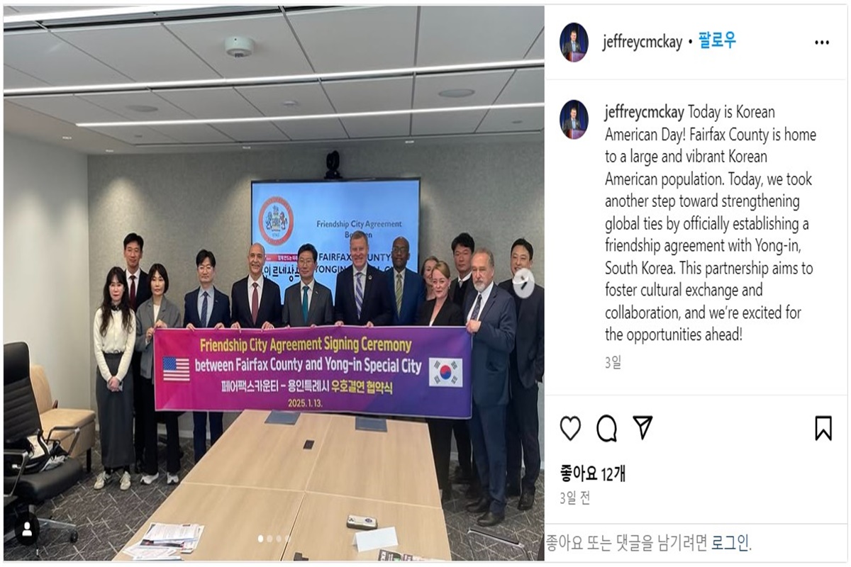 제프리 맥케이 페어팩스 카운티 의장도 자신의 SNS 계정에 용인과 우호교류 협력 체결 소식과 앞으로의 기대감을 담은 게시물을 올리면서 환영의 뜻을 표했다.