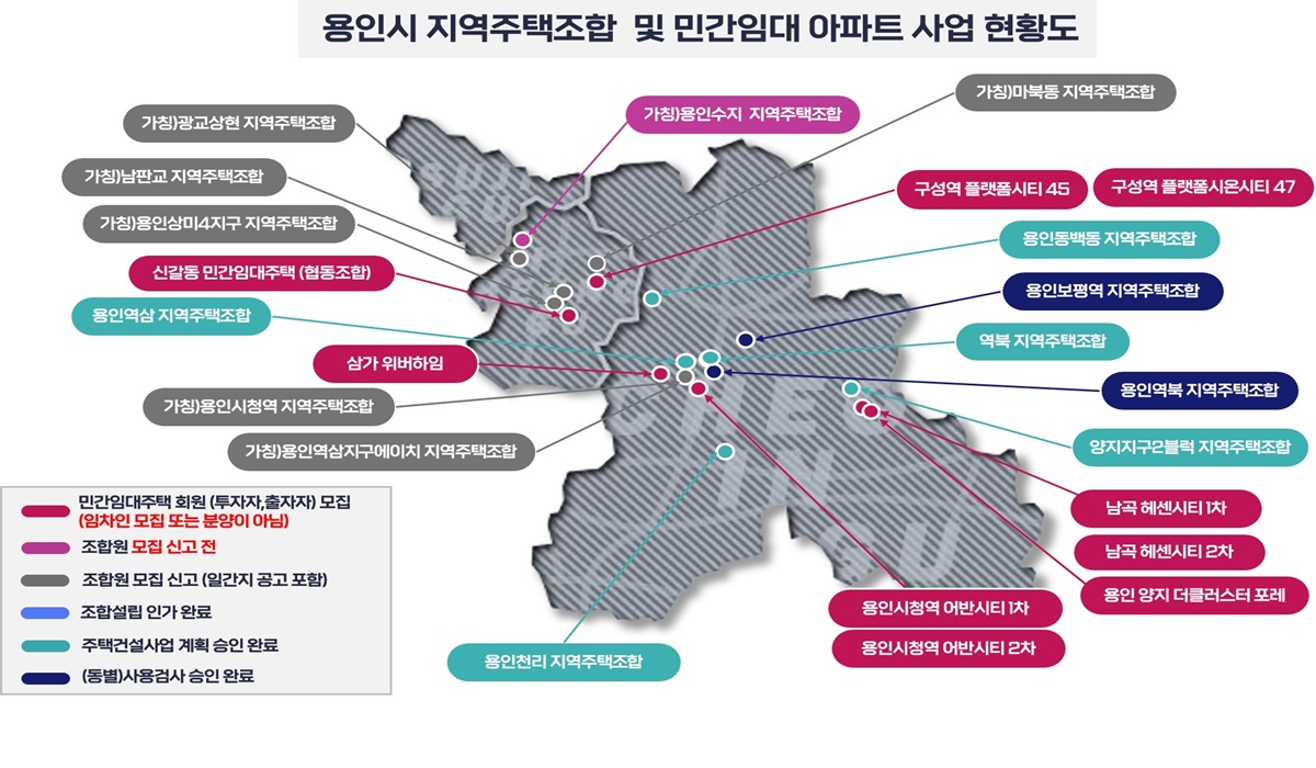 용인특례시 홈페이지(HOME>분야별정보>도시>주택/건축>지역주택조합)에 접속하면 관내 지역주택조합 사업 현황 등을 확인할 수 있다.