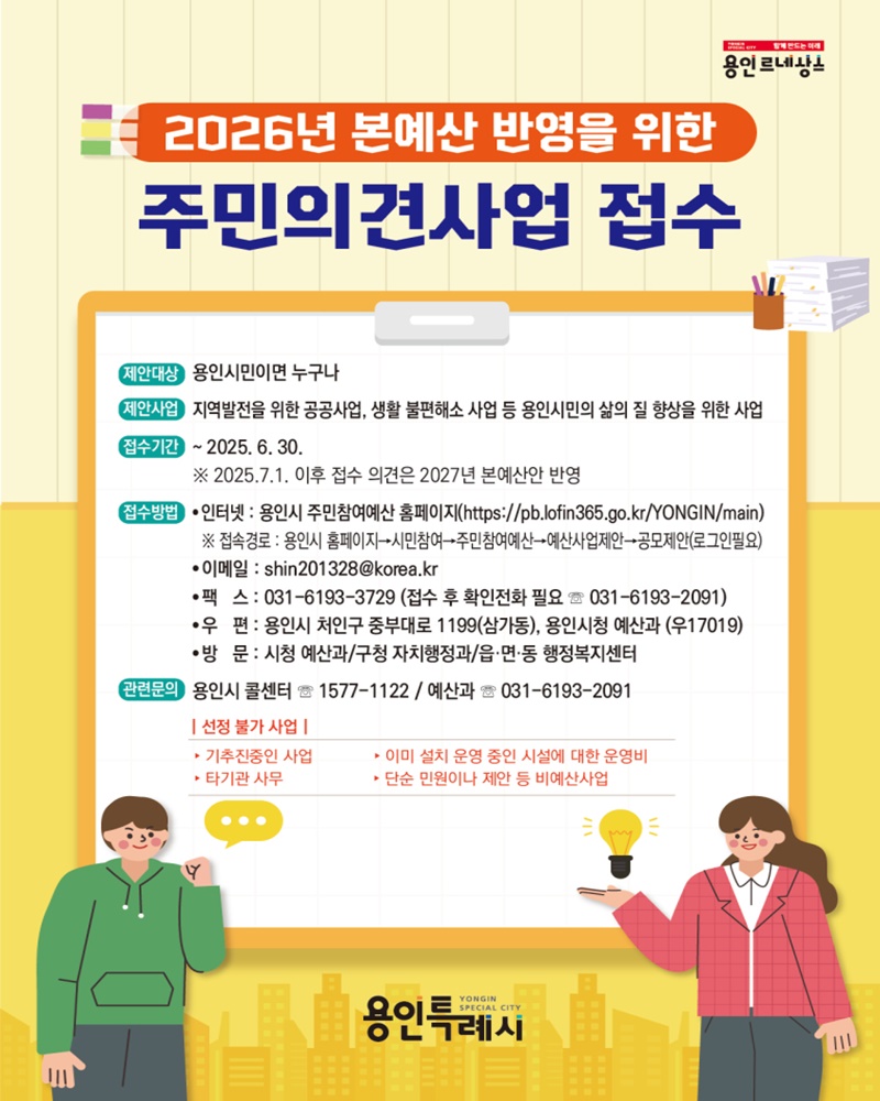 용인특례시(시장 이상일)는 2026년 본예산 반영을 위해 3월부터 6월까지 주민의견사업 집중 접수기간을 운영한다고 5일 밝혔다.