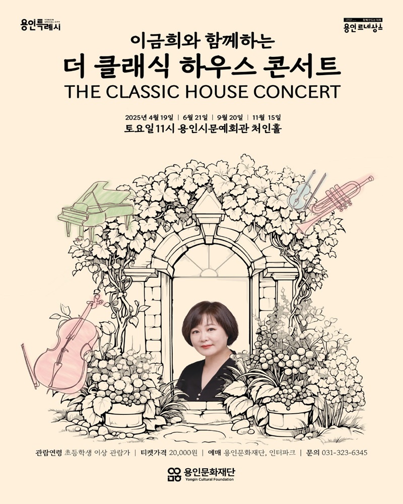 각양각색 4가지 이야기로 다시 찾아온 이금희와 함께하는 2025년 ‘더 클래식 하우스 콘서트’는 초등학생 이상 관람가로 용인문화재단 홈페이지와 인터파크에서 전석 2만 원에 예매할 수 있다. 보다 자세한 사항은 재단 홈페이지를 확인하거나 CS센터(031-323-6345)로 문의하면 된다.