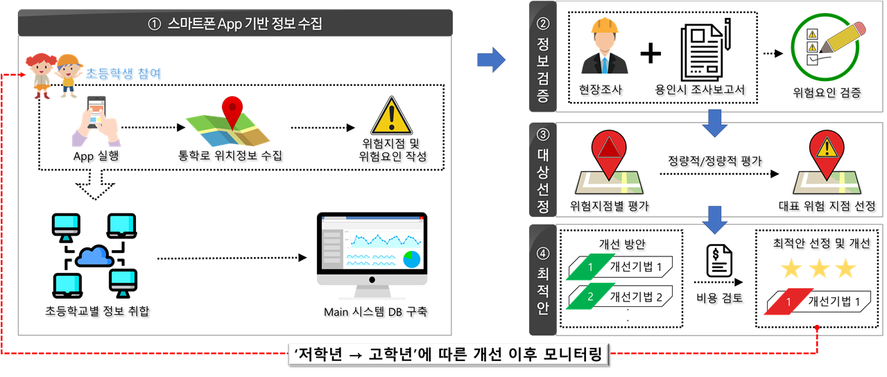 또한, 조사 과정에서 다수의 학생 참여 및 정확한 통학로 확인이 어렵다는 한계가 있었으며, 이를 극복하기 위한 방안으로 학생들의 스마트폰 보유율이 95% 이상임을 고려하여, App 기반의 위치정보 및 위험정보 수집을 제시하였다.