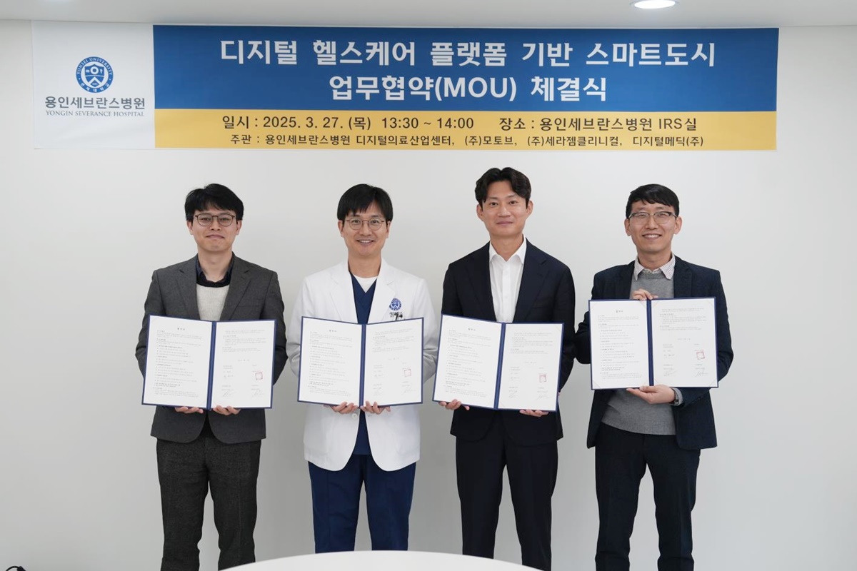 연세대학교 용인세브란스병원(병원장 김은경)은 27일 병원 5층 통합반응상황실(IRS)에서 ㈜모토브, ㈜세라젬클리니컬, 디지털메딕㈜과 함께 ‘디지털 헬스케어 플랫폼 기반 스마트도시’ 공동 기획 및 실증을 위한 다자간 업무협약(MOU)을 체결했다.