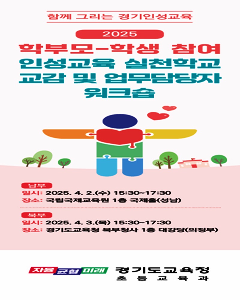 도교육청은 오는 2일과 3일 인성교육 실천학교 118교(초 42교, 중 55교, 고 21교) 교감, 담당교사, 교육지원청 담당 장학사 등 260여 명을 대상으로 국립국제교육원(성남)과 도교육청 북부청사(의정부)에서 남북부 권역별 워크숍을 진행한다.