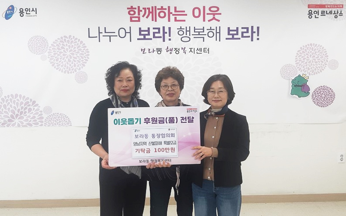 기흥구 보라동에서는 지난 22일, 영남 지역 산불 피해 이재민을 돕기 위한 성금 기탁이 이어졌다. 보라동 통장협의회는 100만 원을, 한전MCS(주) 서수원지점과 서용인지점은 각각 50만 원, 30만 원의 성금을 기탁했다.