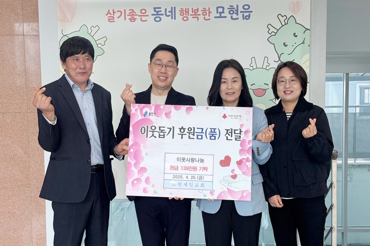 모현읍은 모현제일교회(담임목사 이광현)가 지난 25일 행정복지센터를 방문해 복지사각지대 이웃을 위한 성금 139만원을 기탁했다고 밝혔다. 이 교회 교인들이 부활절을 맞아 지역 내 어려운 가정을 위한 실질적 도움을 위해 20일간 자발적으로 모금했다.