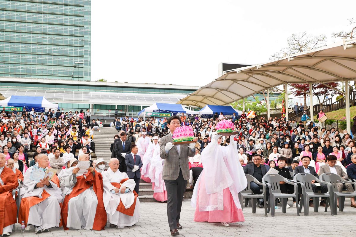 이상일 시장은 법요식에서 향·등·꽃·과일·차·쌀 등 여섯 가지 공양물을 부처님께 올리는 육법공양 의식에 참여하고 헌화했다.