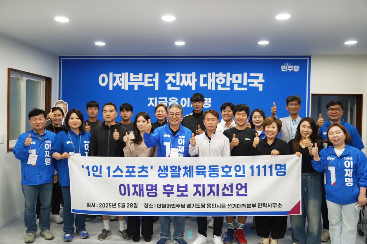 생활체육 동호인 1111명은 28일 더불어민주당 경기도당 선대위 용인시을지역위 선거대책본부에서 손명수 국회의원, 경기도의회 남종섭 의원, 전자영 의원, 용인시의회 임현수 의원, 신나연 의원, 박희정 의원과 함께 이재명 후보 지지를 공식 선언했다.