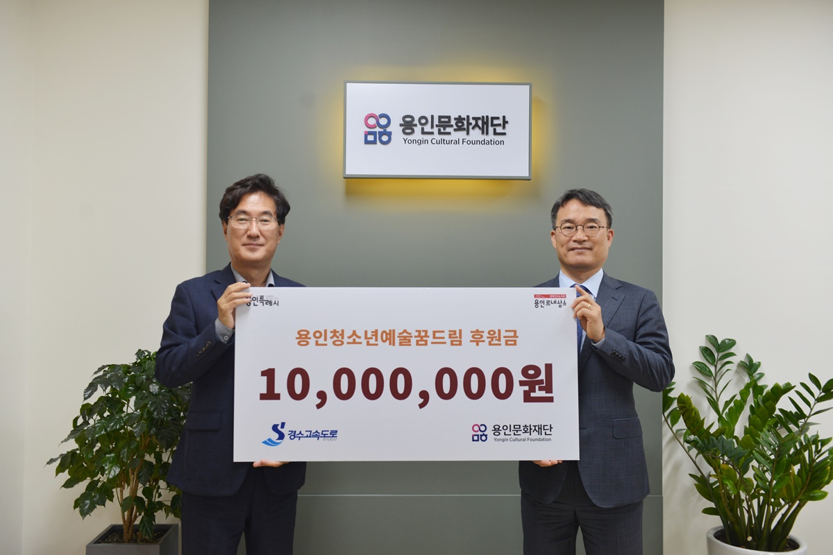 용인문화재단(이사장 이상일)은 지난 13일 경수고속도로㈜(대표이사 김재성)로부터 ‘용인청소년예술꿈드림’ 장학사업 지원을 위한 후원금 1,000만 원을 기탁받았다고 밝혔다.