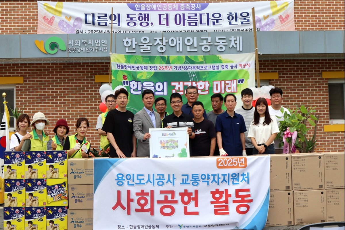 용인도시공사(사장 신경철) 교통약자지원처는 지난 14일(토) 용인시 처인구에 위치한, 한울장애인공동체를 방문해, 창립 26주년 기념행사 및 다목적프로그램실 증축공사 착공식을 지원하며 뜻깊은 사회공헌활동을 펼쳤다.