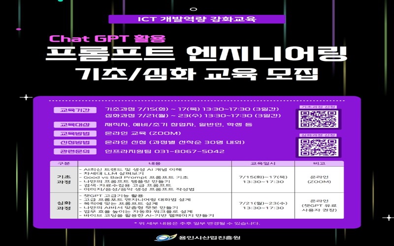 용인시산업진흥원(이사장 이상일)은 ICT(정보통신기술) 인재 양성 및 디지털 기술 활용 역량 제고를 위해, ‘챗GPT 활용 프롬프트 엔지니어링’ 교육을 개설하고 참가자를 모집한다고 밝혔다.