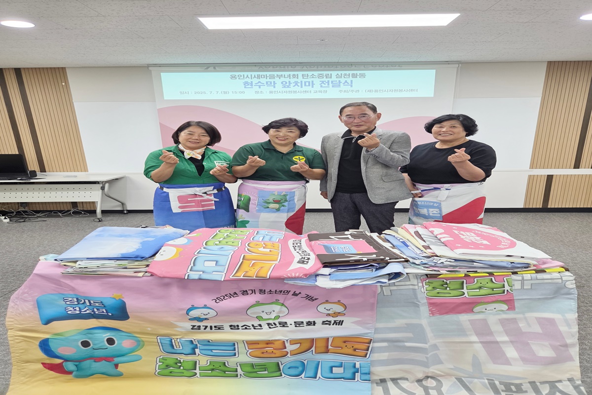 용인시자원봉사센터(센터장 권오성) 소속 ‘용인시동그라미소세지 봉사단’은 지난 7월 7일 폐현수막을 재활용해 제작한 앞치마 60매를, 푸른공원사업소 공원관리과에 기부했다.
