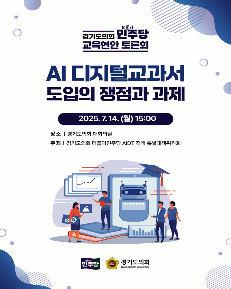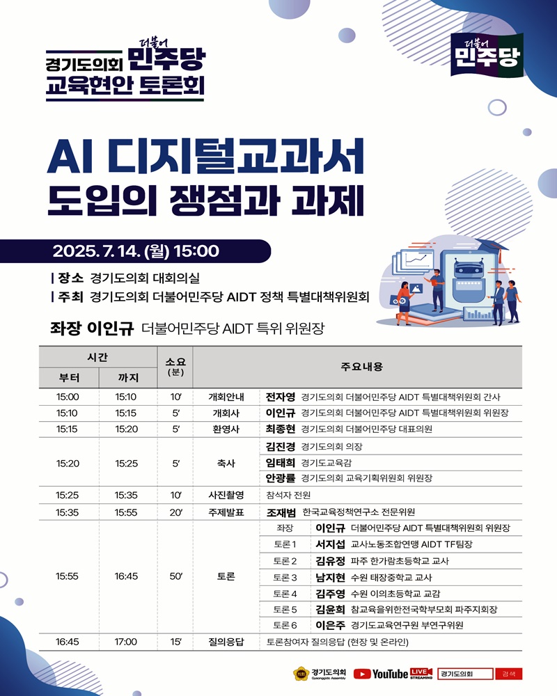 ‘AI 디지털교과서 도입의 쟁점과 과제’를 주제로 한, 경기도의회 더불어민주당 교육현안 토론회가 오는 7월 14일(월) 오후 3시, 경기도의회 대회의실에서 개최될 예정이다.