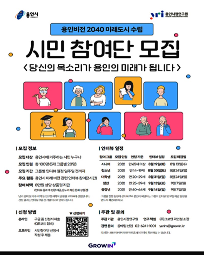 미래 용인의 청사진을 시민과 함께 설계하기 위한 이번 모집은 총 100명 규모로 진행되며, 청소년, 대학생, 청년, 중장년, 시니어까지 5개 그룹으로 구성된다.
