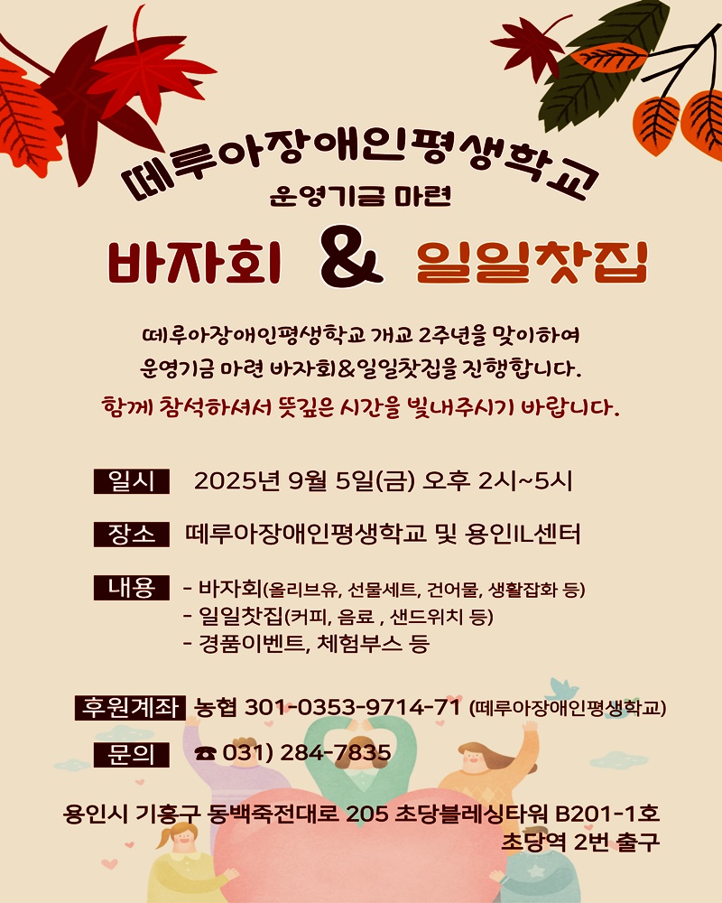 떼루아장애인평생학교(교장 김정태)는 개교 2주년을 기념해, 오는 9월 5일 오후 2시부터 5시까지 본교 및 용인IL센터에서 ‘운영기금 마련 바자회 & 일일찻집’을 개최한다고 1일 밝혔다.