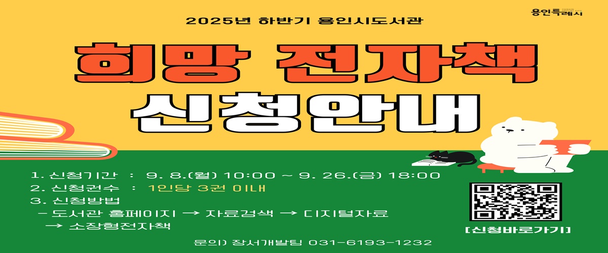 용인특례시(시장 이상일)는 오는 9월 8일부터 26일까지, 상반기에 이어 하반기 전자책 희망 도서 신청을 받는다고 3일 밝혔다.