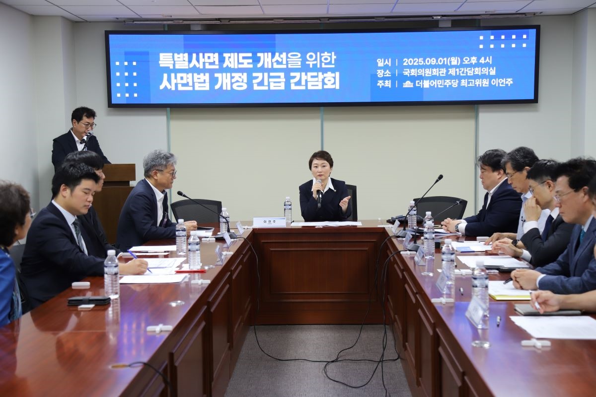 이언주 더불어민주당 최고위원(미래경제성장전략위원장, AI강국위원회 AX분과장)이 9월 1일 오후, 국회의원회관 제1간담회실에서 <특별사면 제도 개선을 위한 사면법 개정 긴급간담회>를 개최했다.