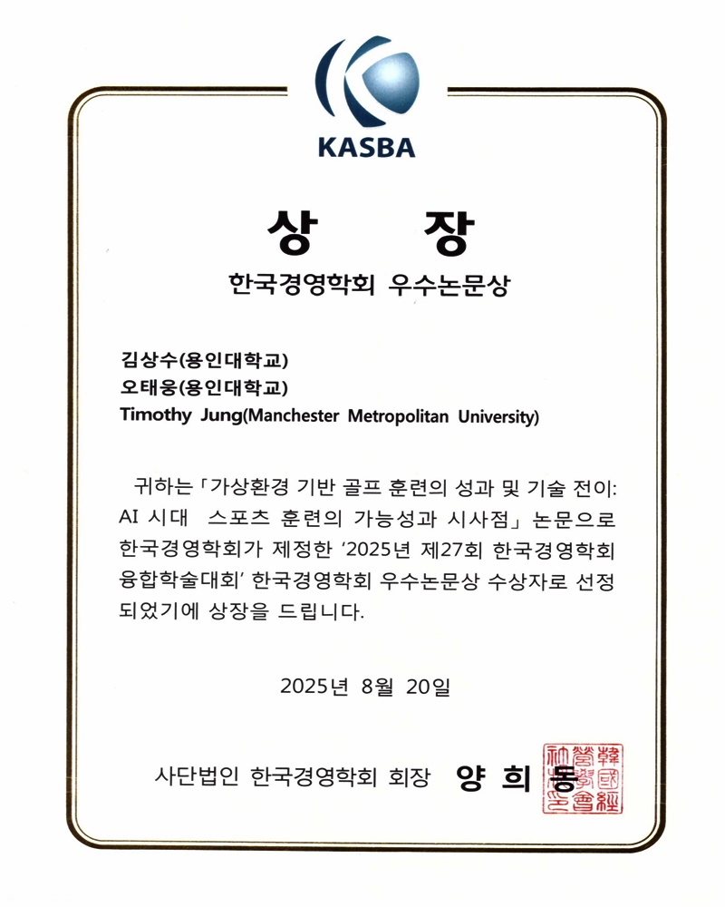 용인대학교 융합연구, 한국경영학회 융합학술대회 우수논문상 수상. VR 기반 스포츠 훈련 효과 입증