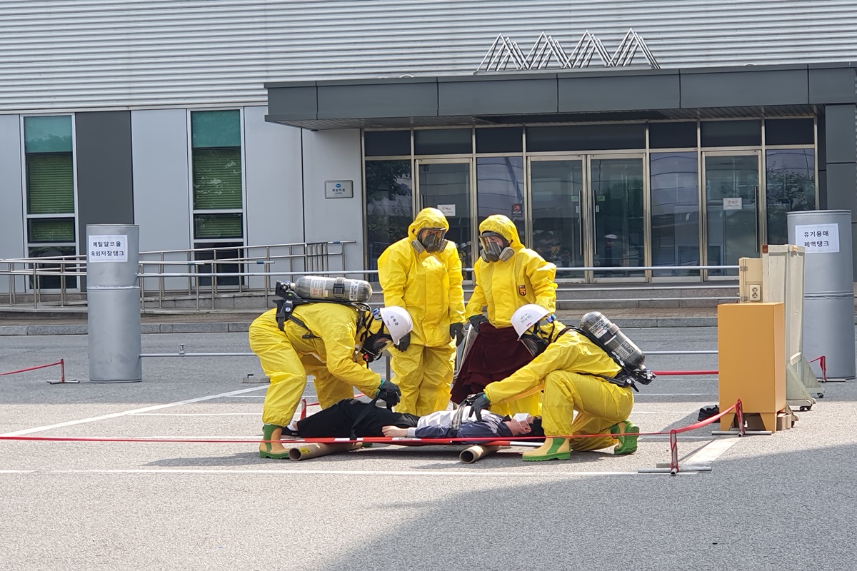 유해화학물질인 메틸 알코올 누출로 인한 화재 상황을 설정해 진행한 이 훈련은 자체 매뉴얼에 따라 ▲비상 상황 긴급전파 ▲소방대 초동 조치 ▲화재 진압 ▲인명구조 ▲사고 복구 등으로 구성됐다.