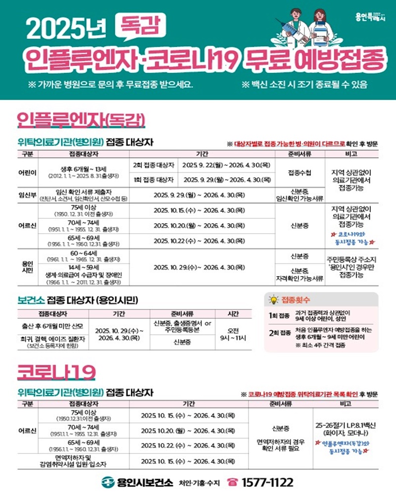 용인특례시(시장 이상일)는 10월 15일부터 내년 4월 30일까지, 지역 내 290개 위탁의료기관에서 코로나19 무료 예방접종을 시작한다고 13일 밝혔다.