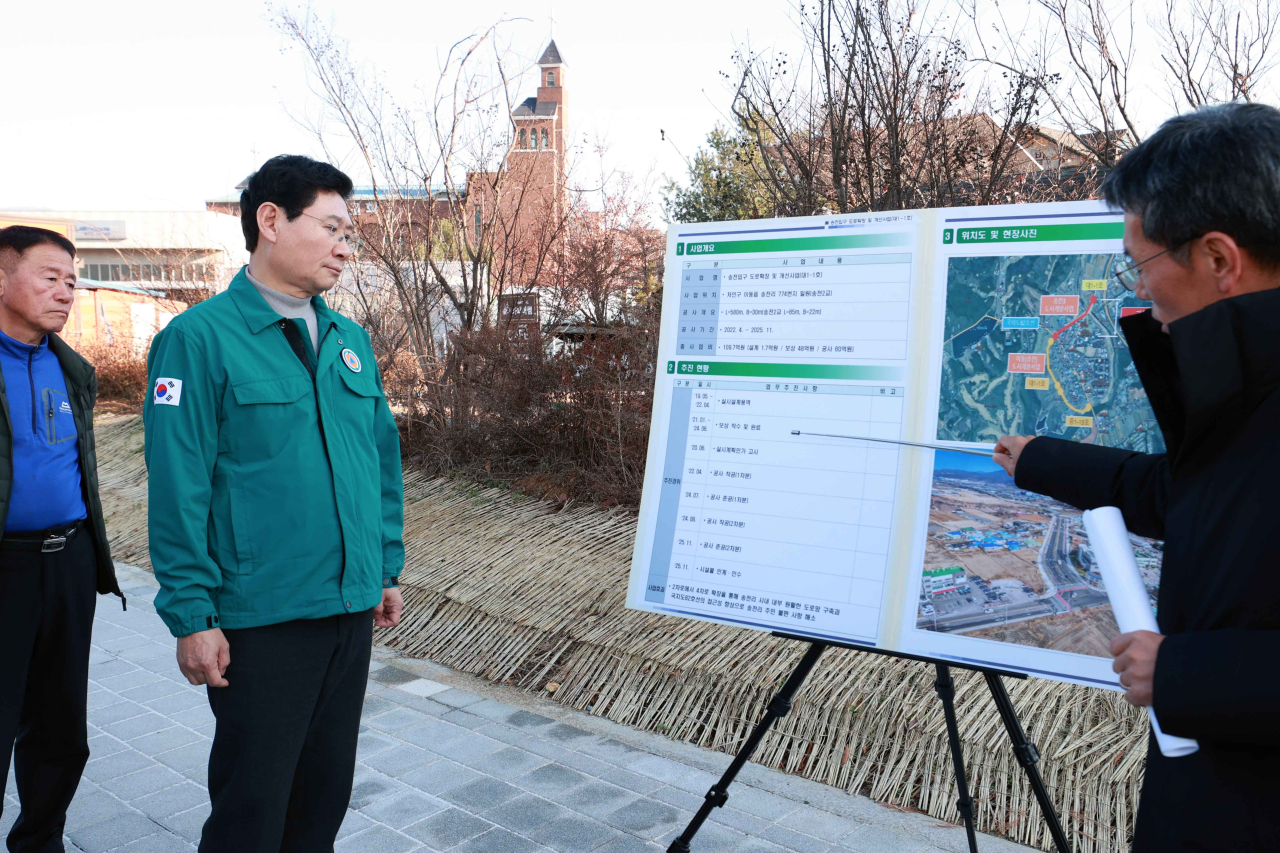 이상일 용인특례시장이 18일 처인구 이동읍 송전리의 ‘송전입구 도로확장 및 개선사업’ 현장을 점검했다.
