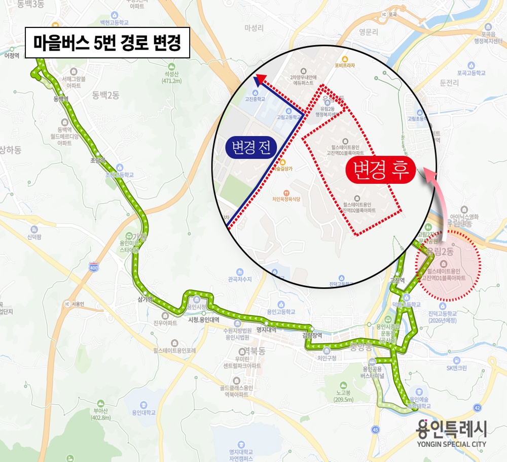 용인특례시(시장 이상일)는 오는 10일부터 시내버스 8번과 마을버스 5번이, 유림2동 고진역 힐스테이트 1,2 단지 내부를 경유하도록 노선이 변경된다고 8일 밝혔다.