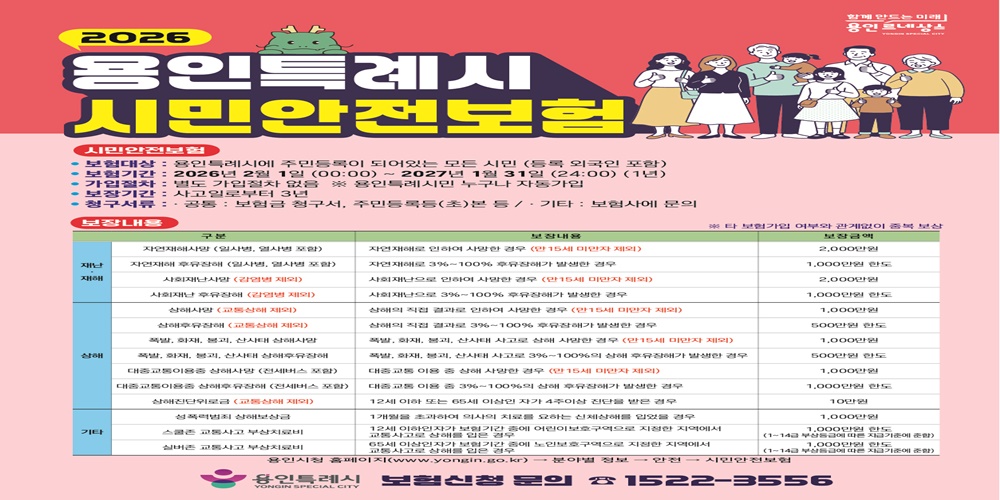 자세한 내용은 용인특례시 홈페이지(www.yongin.go.kr) ‘시민안전보험’에서 확인할 수 있다.
