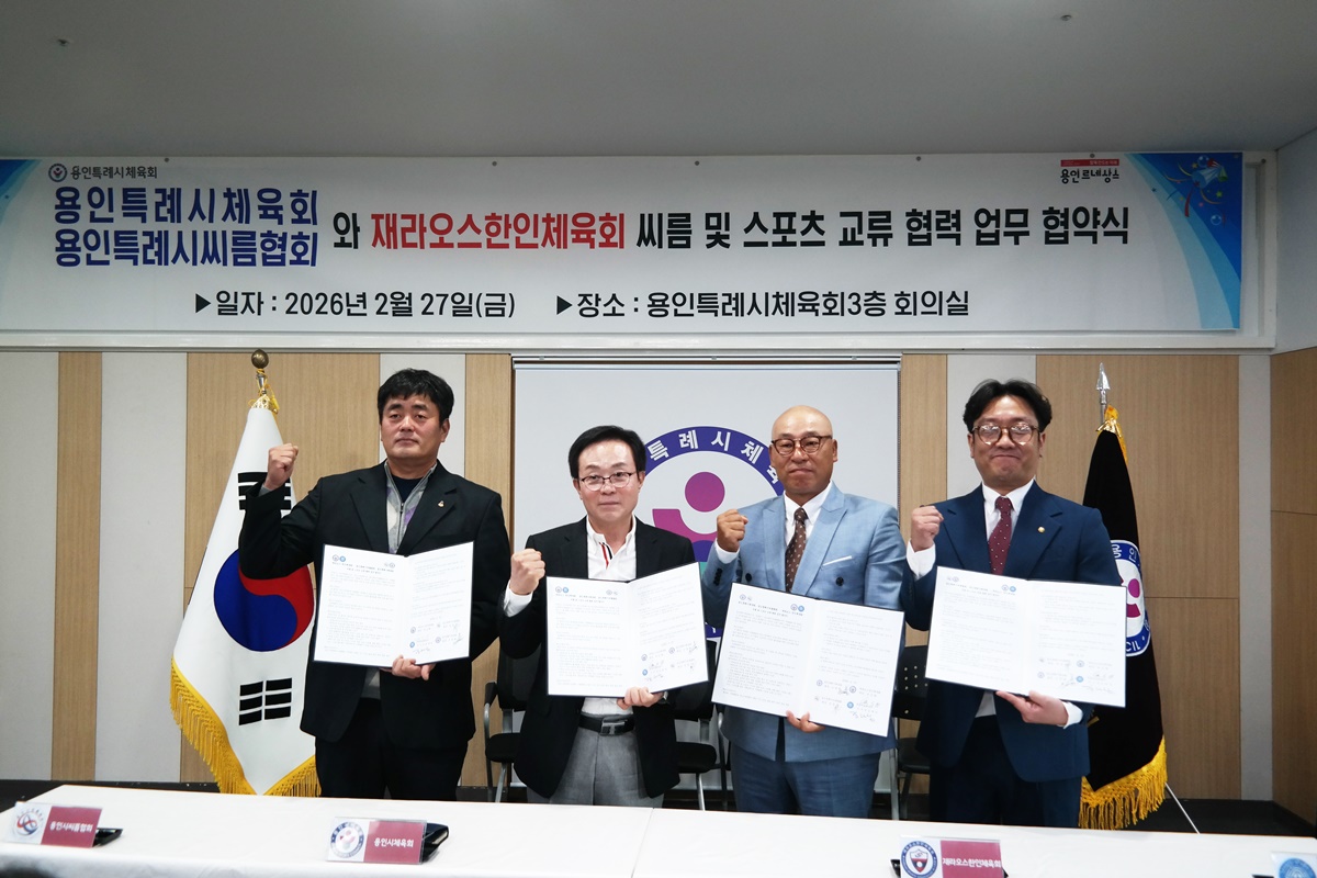 용인특례시체육회(회장 오광환)와 용인특례시씨름협회(회장 정충근)는 2월 27일 용인특례시체육회 회의실에서 재라오스한인체육회(회장 차승환)와 씨름 및 스포츠 교류협력을 위한 업무협약을 체결했다.