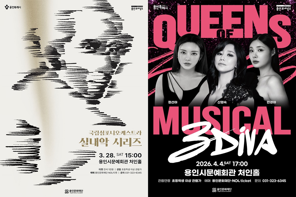 용인문화재단은 용인시문예회관 처인홀에서 봄을 맞아 시민들을 위한 다채로운 기획공연을 선보인다. 오는 3월 28일에는 <국립심포니오케스트라 실내악 시리즈>, 4월 4일에는 <뮤지컬 3DIVA 콘서트>가 차례로 개최되며 클래식과 뮤지컬을 아우르는 무대로 관객들을 만난다.