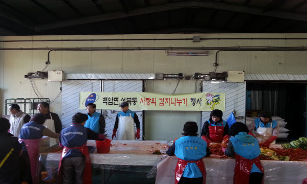 이른 아침부터 시작된 행사에 백암면, 성복동 주민자치위원 및 주민 40여명이 참여, 1천 포기의 김장김치를 만들어 백암면, 성복동의 국민기초생활수급자, 독거노인 가구 등에 전했다.