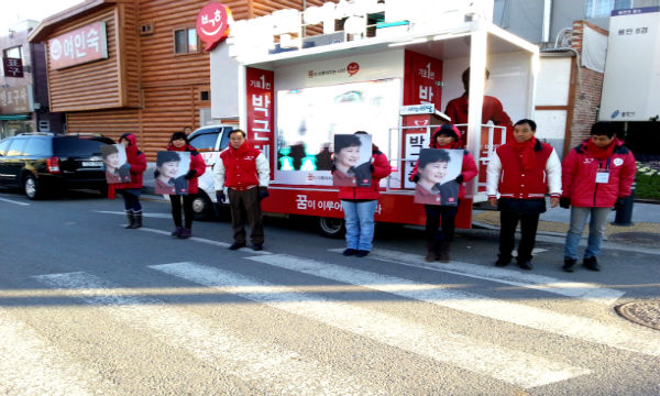 오전8시부터 용인사거리에서 박근혜 후보지지 선거운동이 이우현 국회의원을 비롯해 시·도의원들과 새누리당 핵심당원 및 처인구민들이 모인 가운데 이우현 의원은 시민들을 향해 박근혜 후보를 적극 지지해줄 것을 당부하면서 헌정사상 첫 여성대통령이 나올 수 있게 적극적인 지지를 호소했다.