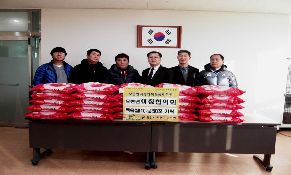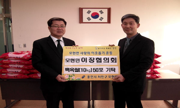 용인시 처인구 모현면 이장협의회(대표 정연주)가 지난 20일 모현면사무소를 방문해 관내 어려운 이웃을 위해 써달라며 쌀 50포( 10 kg/포)를 전했다. 이날 기탁한 쌀은 모현면 이장협의회에서 용인시의 고품질 브랜드 쌀인 용인백옥쌀을 직접 구매하여 관내 저소득층을 위해 제공한 것이다. 모현면 이장협의회는 매년 훈훈한 이웃사랑을 실천하며 모두가 함께하는 공동체 조성에 큰 힘을 보태고 있다.