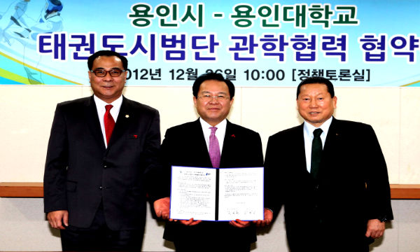 이날 협약식은 김학규 용인시장, 김정행 용인대학교 총장, 이우현 용인시의회 의장 등 10여명의 관계자들이 참석한 가운데 ▶용인시의 용인대학교 태권도시범단 예산 지원 ▶용인시 행사 시 용인대학교 태권도 시범단 우선 요청권 ▶태권도 시범단 도복에 용인시 또는 용인시 로고 부착 등을 주요 내용으로 담은 협약서를 교환했다.