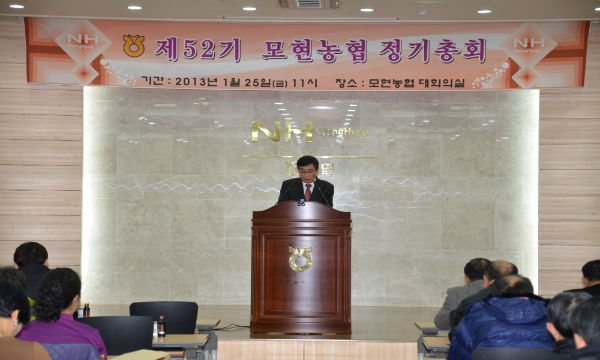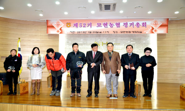 세계 경제의 끝없는 추락과 부동산시장의 장기침체는 우리농협의 경영에도 많은 도전과 시련을 안겨 주었습니다. 하지만 우리에게는 저력이 있었습니다. 여기계신 대의원 임원, 여러분들의 적극적인 성원과 관심 속에서 우리농협이 계획했던 2012년도 사업 실적을 달성할 수 있었습니다. 재무의 건정성과 사업추진의 목표설정에 맞춰 단기 순익 20억8천만원과 교육지원 사업 13억원을 올려 농민 조합원들께 실익을 주었으며, 특히 마트사업은 경제가 어려운데도 내농협이라는 주인의식과, 여기계신 조합원 여러분들의 노력으로 우리 모현농협이 147억 실적을 올려 가장 많은 실적을 올린 한해 였 던 것 같습니다.